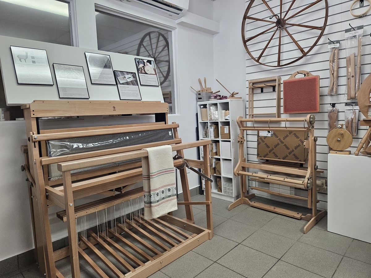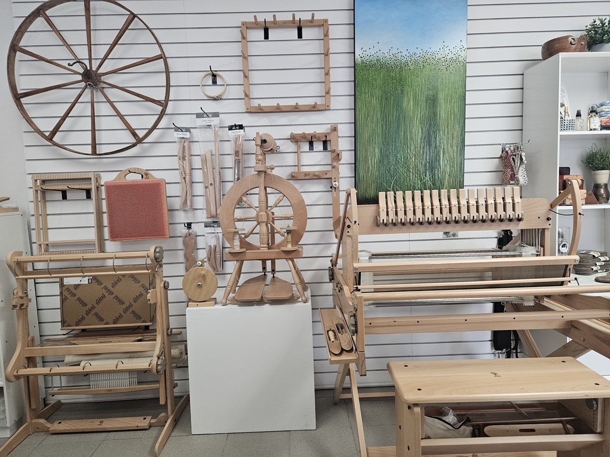 Attirail est aussi l’un des points de référence au Saguenay en ce qui concerne les équipements dans le domaine du textile: applicateurs d’huile divers, machine à tricoter antique, en passant par une gamme de métiers à tisser plus modernes de la marque Ashford, dont l’entreprise est la principale dépositaire. La propriétaire possède également deux rouets de différentes tailles, avec lesquels elle produit de la laine filée à longueur de semaine.