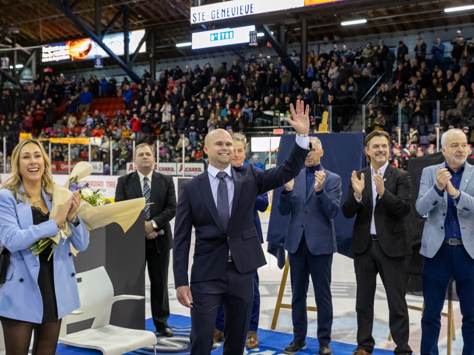 Lors du retrait de son chandail qu’il dit avoir porté avec fierté il y a déjà 25 ans, Pierre-Marc Bouchard était accompagné de ses deux filles et de sa conjointe.