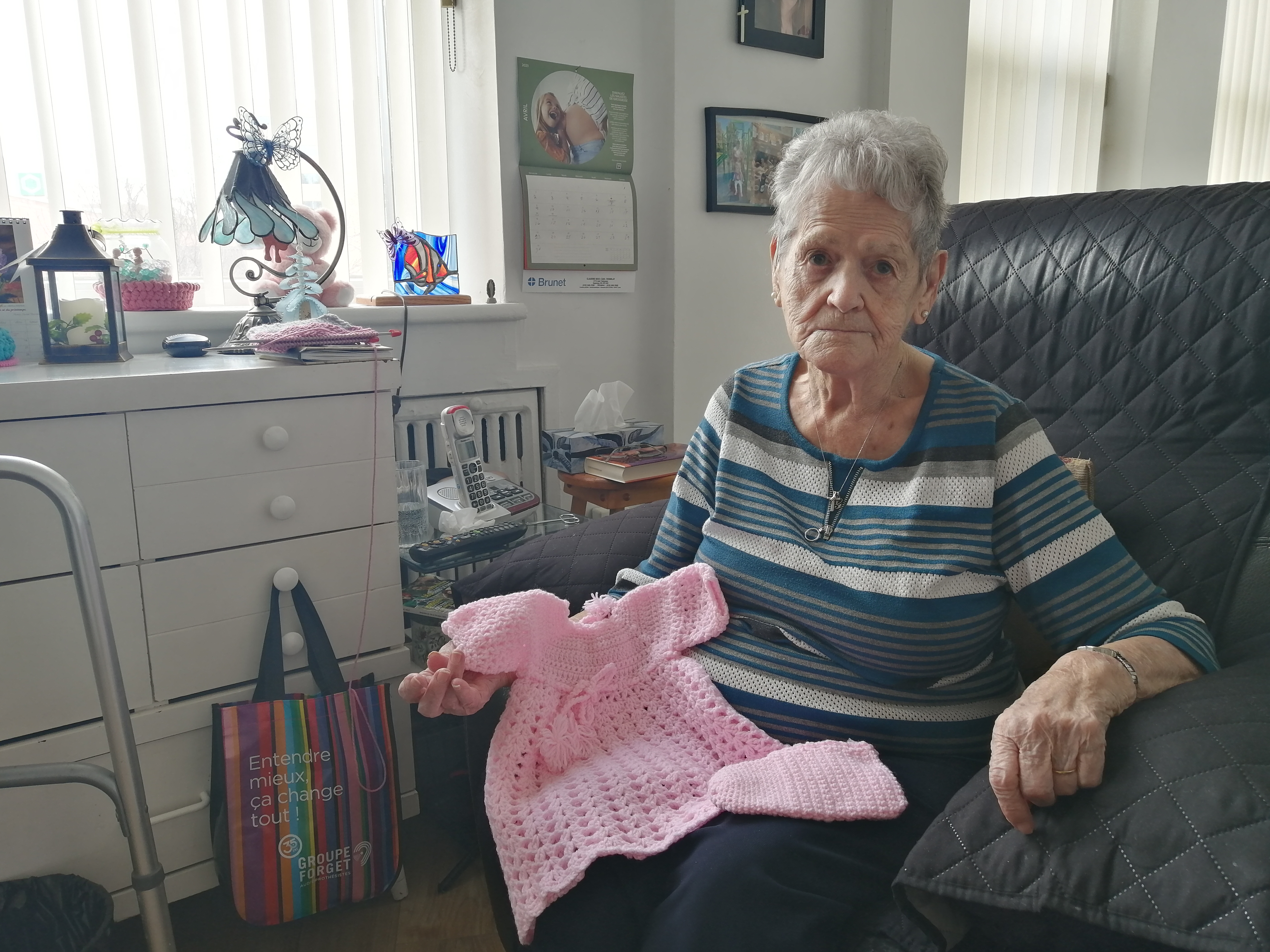 À 97 ans, Gemma Fortin maitrise l’art du tricot depuis maintenant trois ans. Elle peaufine sa technique par le biais de quatre heures de « pratique » chaque jour. Les ensembles qu’elle fabrique sont ensuite expédiés en Afghanistan, pour les bébés et les enfants.