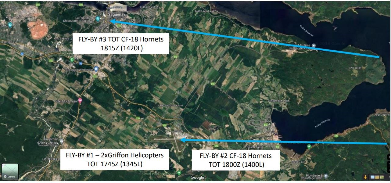 L'opération a été baptisée « Fierté en puissance » et le survol aura lieu approximativement vers 14h20 selon les autorités de la base militaire. Les CF-18 voleront au-dessus de Saguenay, d’est en ouest, à une altitude d’approximativement de 1000 pieds au-dessus du point le plus haut de son itinéraire.