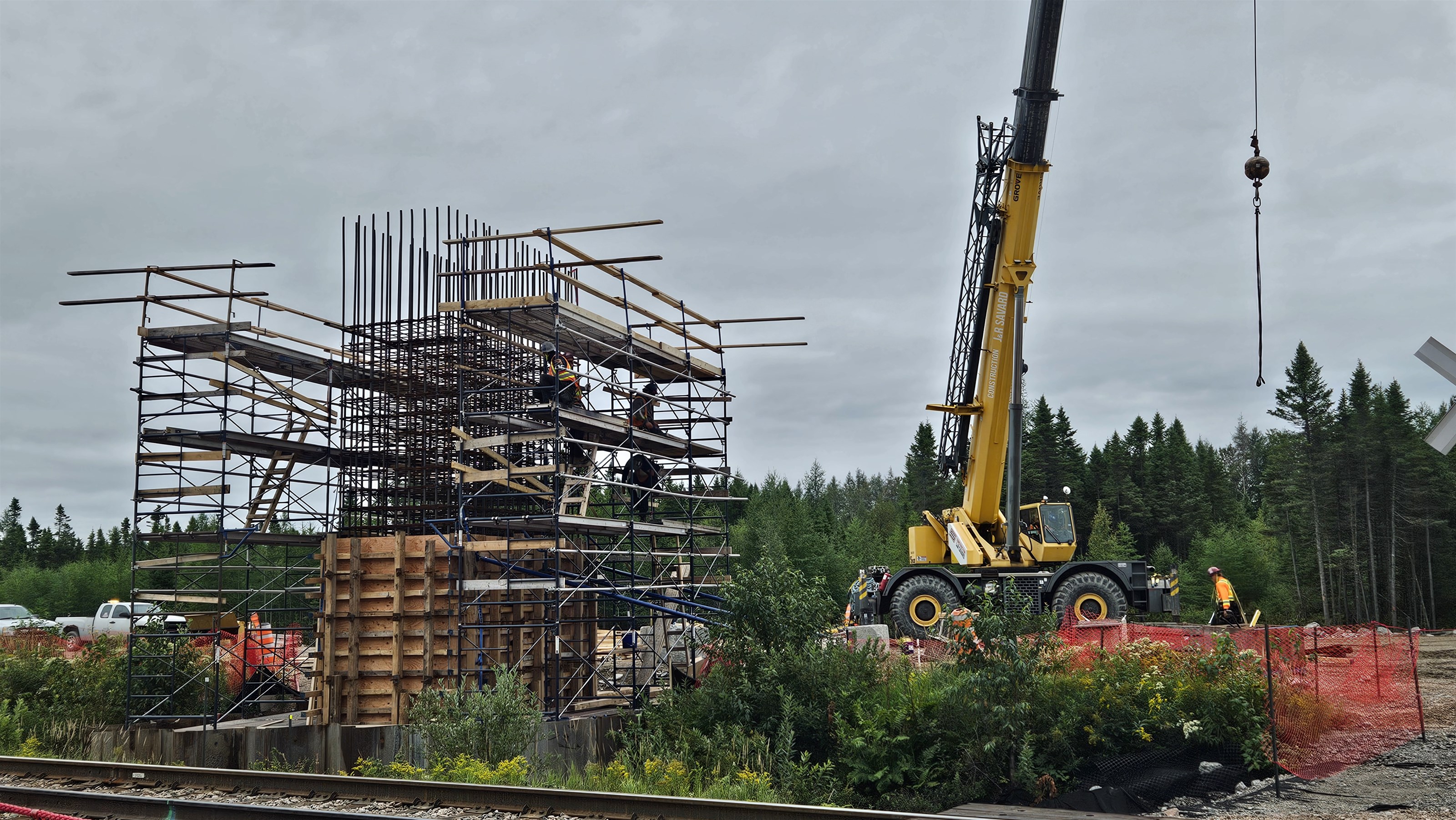 « 6000 m2 de béton ont été coulés. À l’heure actuelle, ça équivaut à 2,5 piscines olympiques, donc sur les structures verticales et dans le sol. On est à 85% d’avancement pour le pont nord et à 40% pour le pont sud. 45 travailleurs sont à pied d’œuvre aujourd’hui, sur les coffrages, l’armature. Jusqu’à 75 à 80 travailleurs ont été là lors de moments plus fastidieux du chantier », a indiqué l’un des gérants du projet, Pierre-Luc-Lavoie.