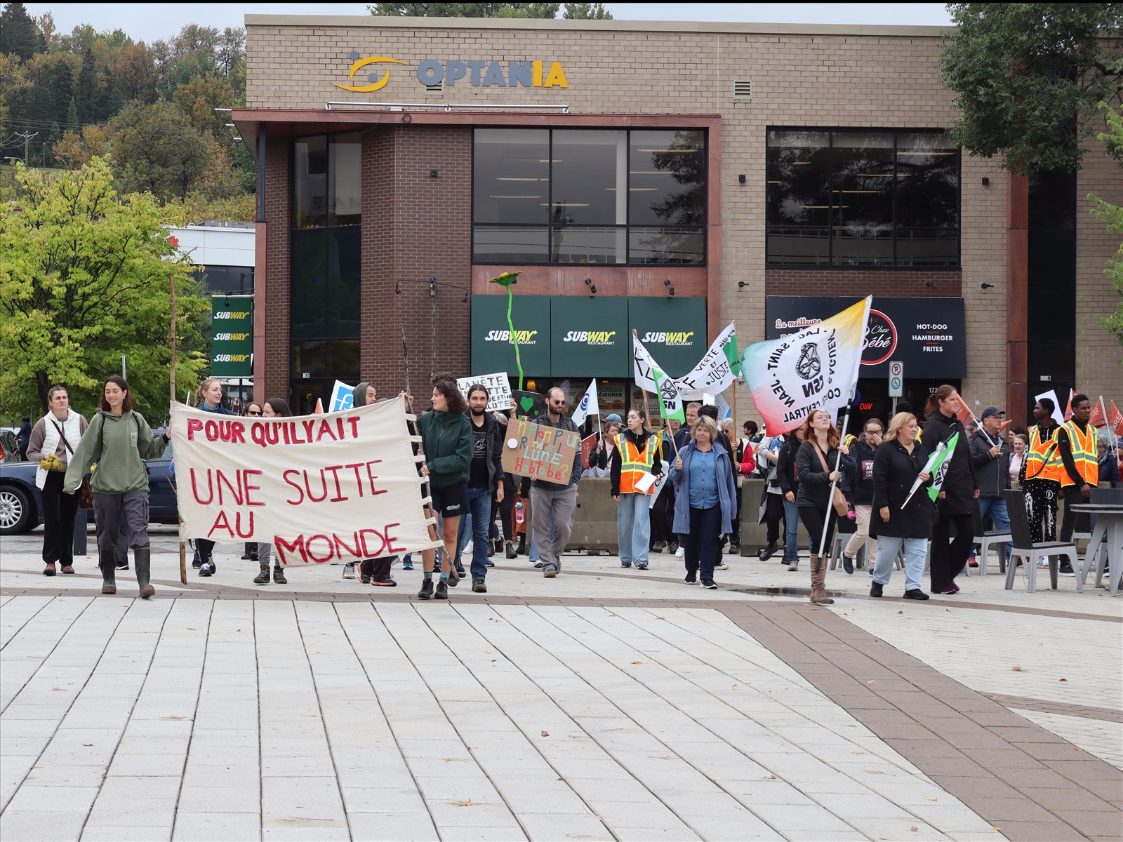 C’est vers 11h00 que la mobilisation citoyenne a pris place, à l’UQAC, avant que cette dernière ne converge à 11h30 vers la Place du citoyen à Chicoutimi. Le rassemblement avait notamment pour but de revendiquer des solutions à mettre en œuvre pour une transition écologique et sociale bénéfique pour la population, dans un contexte où les changements climatiques prennent de plus en plus d’ampleur.