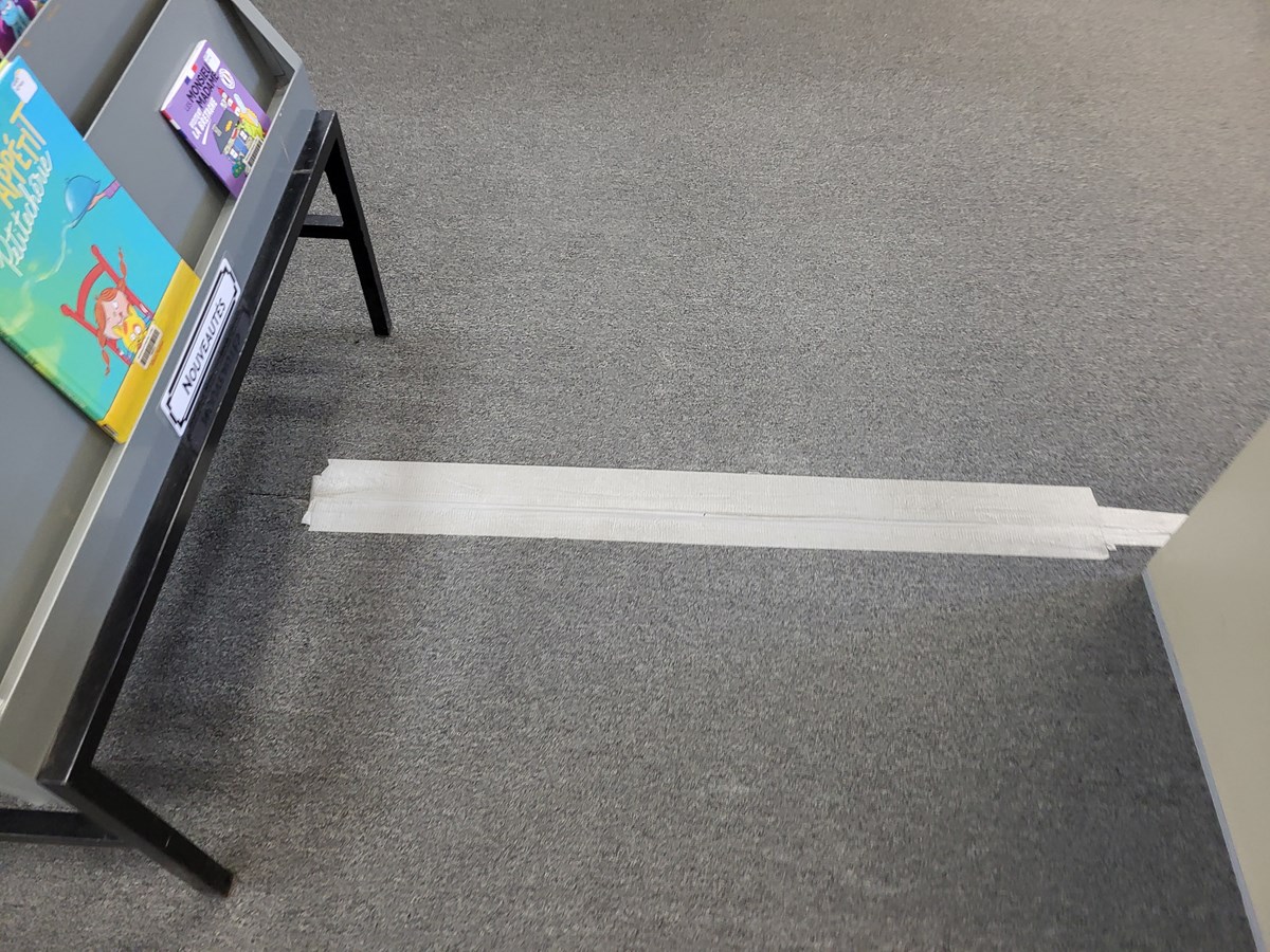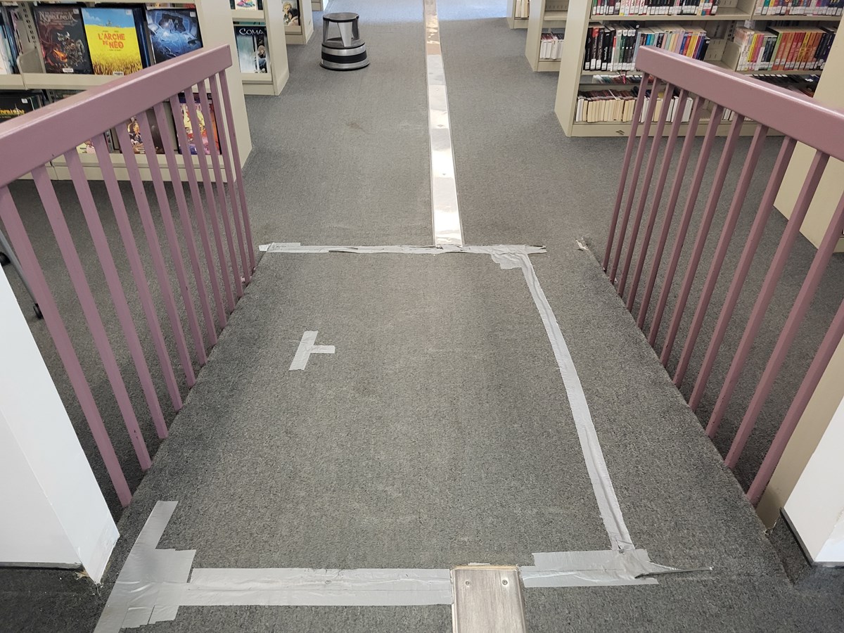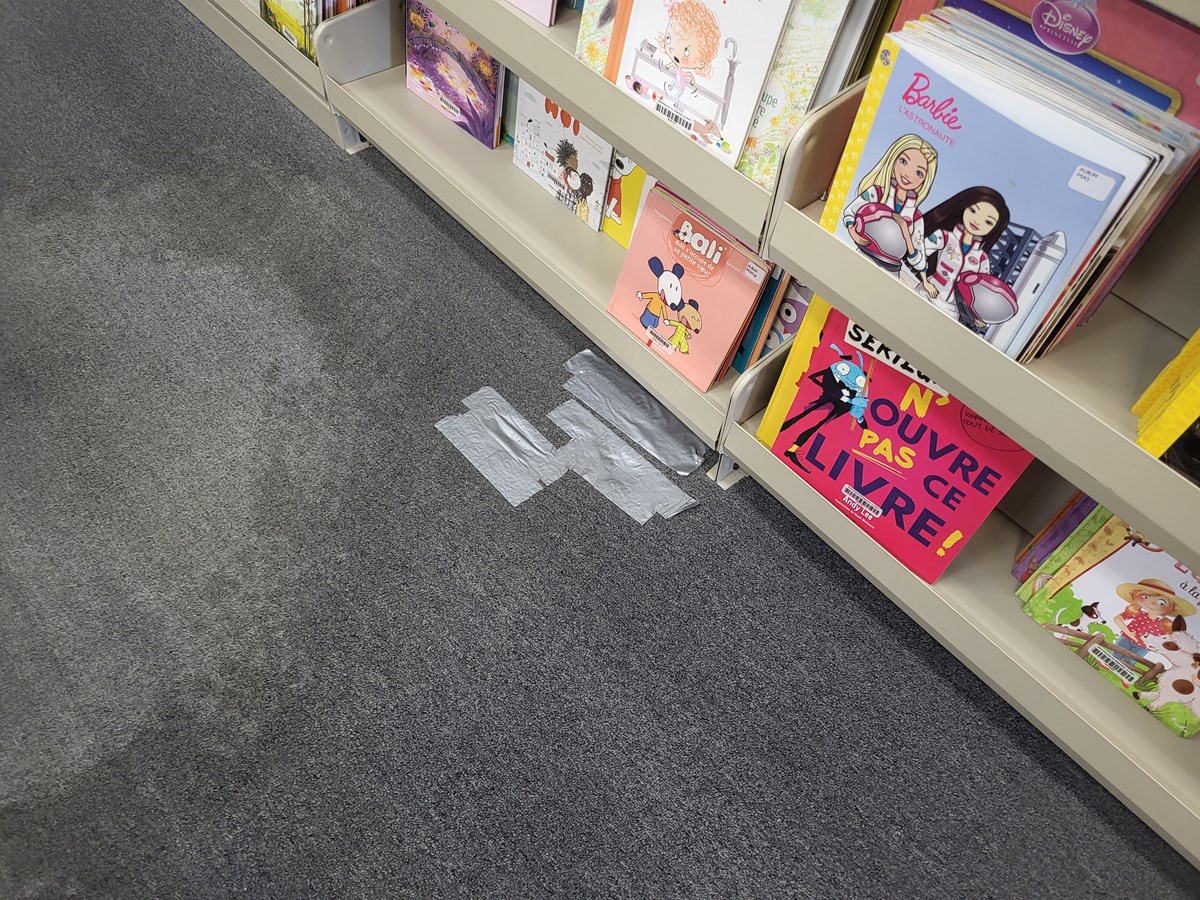 Les employés utilisent le ruban adhésif bien connu pour tenir en place le tapis d’origine. Une visite des lieux a permis de constater qu’on en retrouve à peu près partout, sur les deux étages que compte la bibliothèque.
