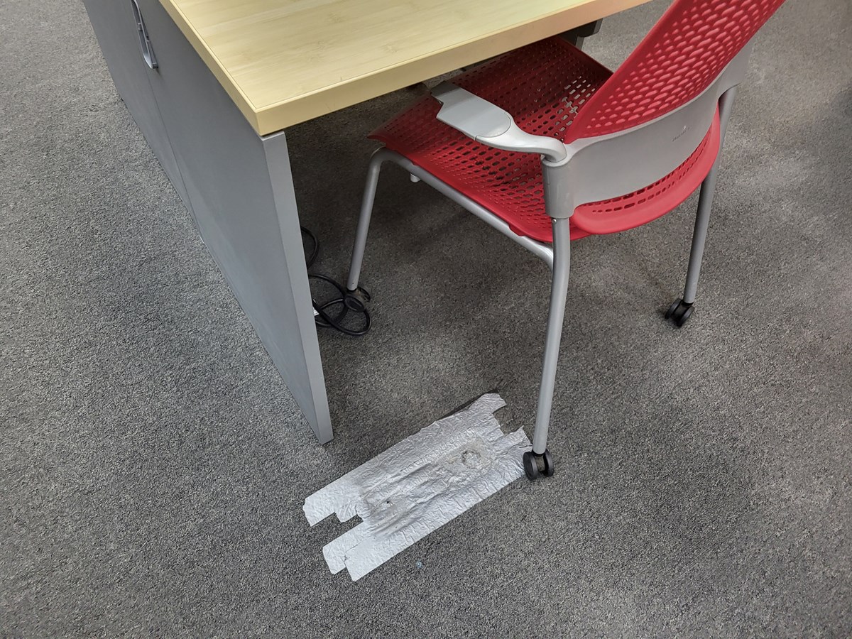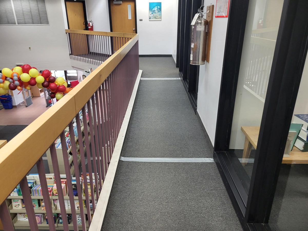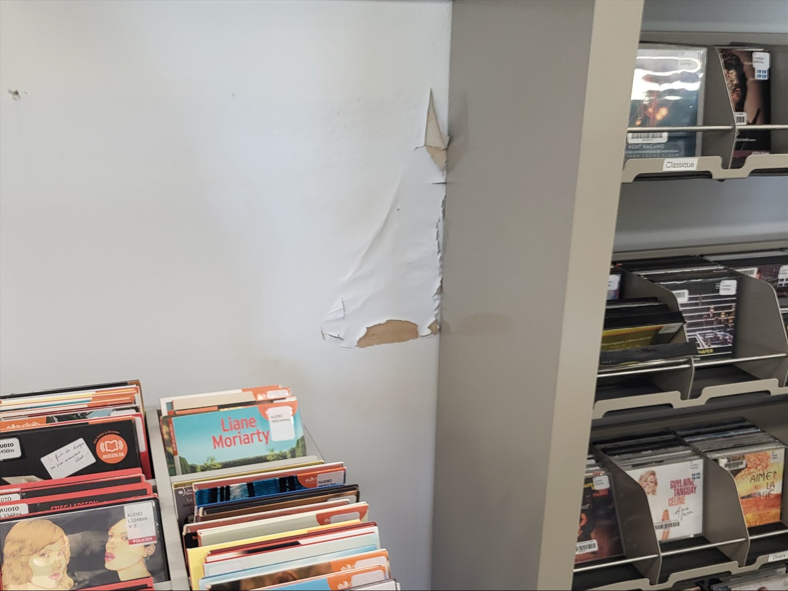 Les employés utilisent le ruban adhésif bien connu pour tenir en place le tapis d’origine. Une visite des lieux a permis de constater qu’on en retrouve à peu près partout, sur les deux étages que compte la bibliothèque.