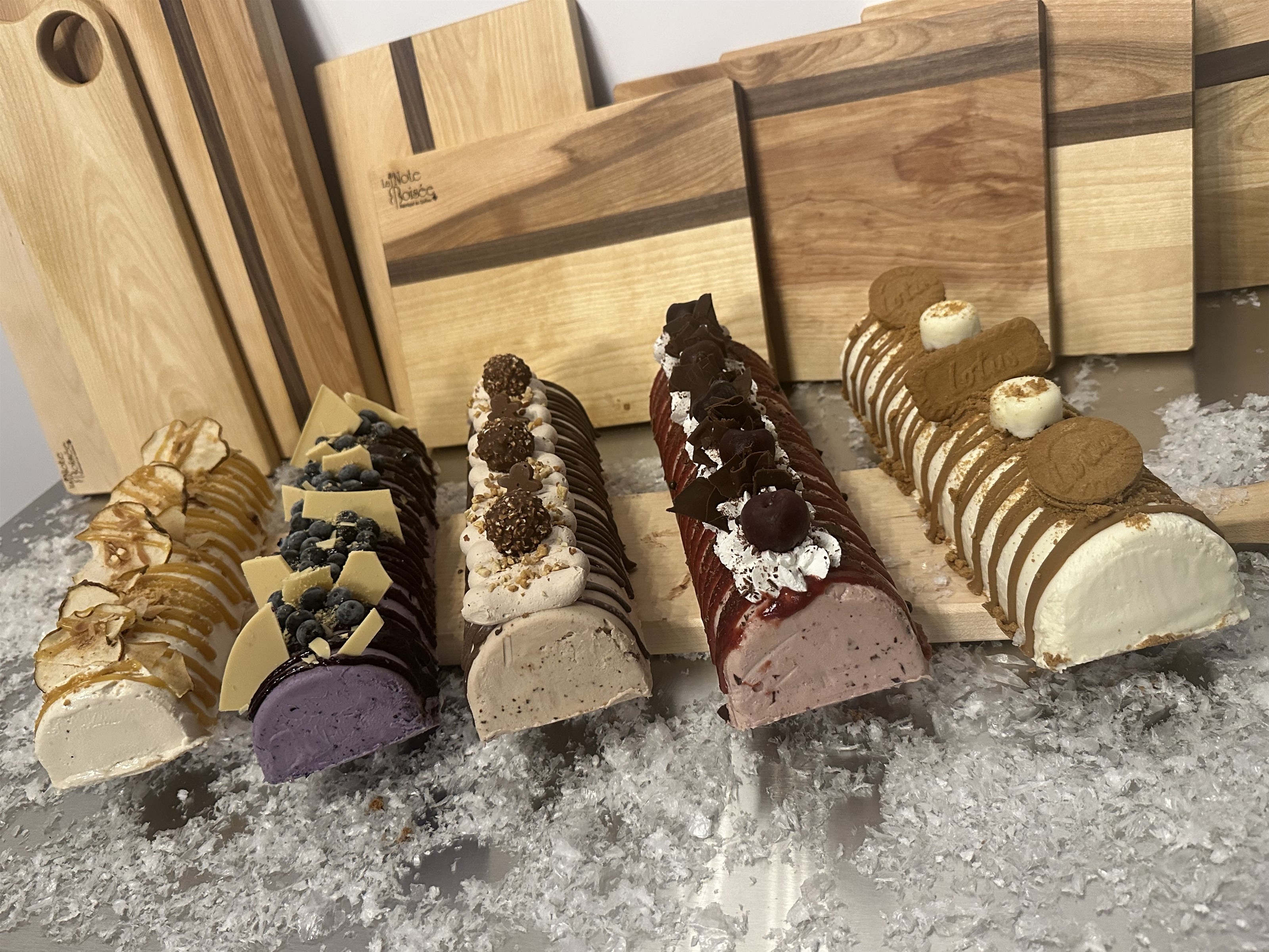 La clientèle a le choix entre plusieurs saveurs de bûches, dont érable, sucre à la crème, biscuits et crème, praliné, Choco Extrême ou caramel fleur de sel. Tout est fait à la main, localement, et les commandes sont personnalisées en fonction des goûts des clients.