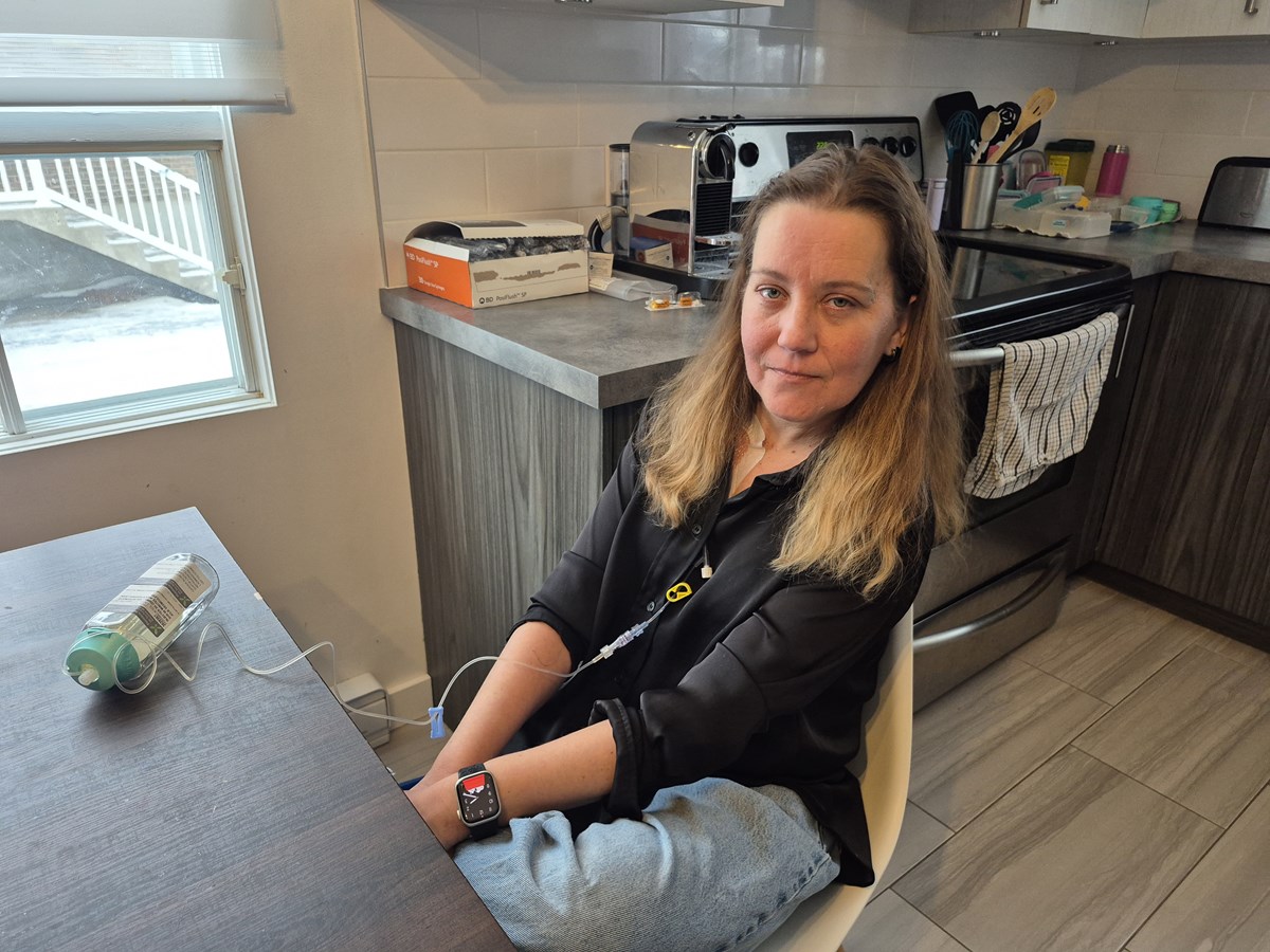 Ann Julie Desmeules a dû cesser de travailler en juillet dernier, incapable de continuer en raison de sa maladie. Elle doit maintenant constamment se promener avec une aiguille sur son abdomen afin de recevoir des antibiotiques par voie intraveineuse.