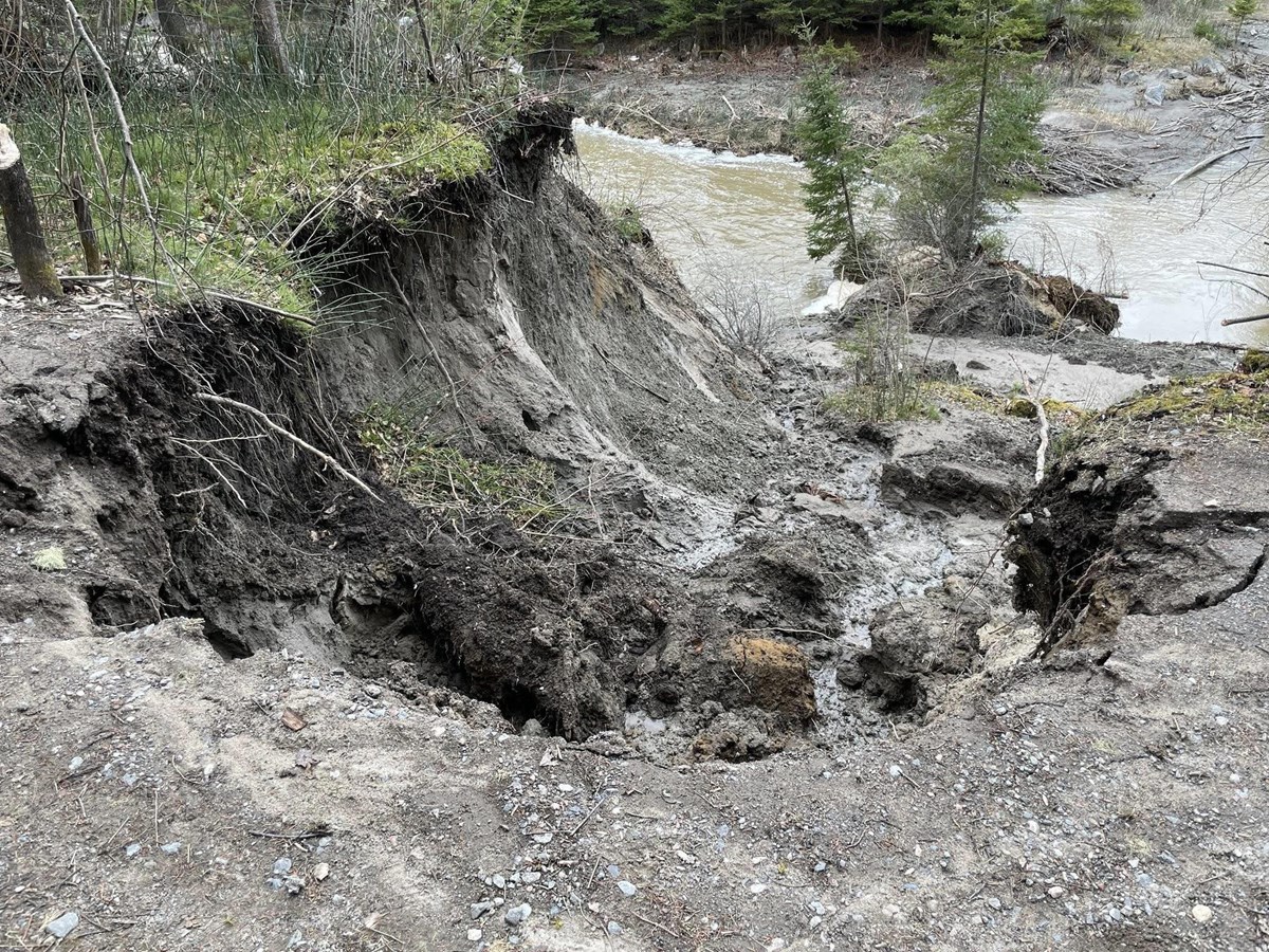 54 ans jour pour jour après le désastre de St-Jean-Vianney, les pluies des derniers jours ont causé un glissement de terrain dans les sentiers du Manoir du Saguenay, directement en face de l’ancien village abandonné.
