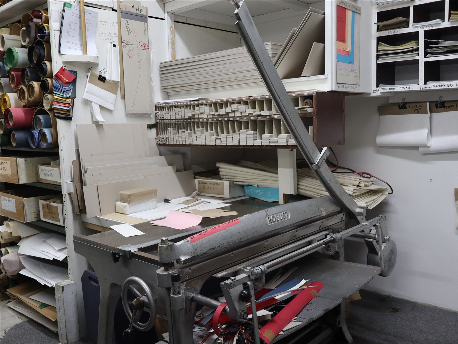 Dans son atelier, la colle est appliquée généreusement et le bougran – ce tissu raide en coton qui recouvre les couvertures rigides – se fait de plus en plus rare et coûteux.