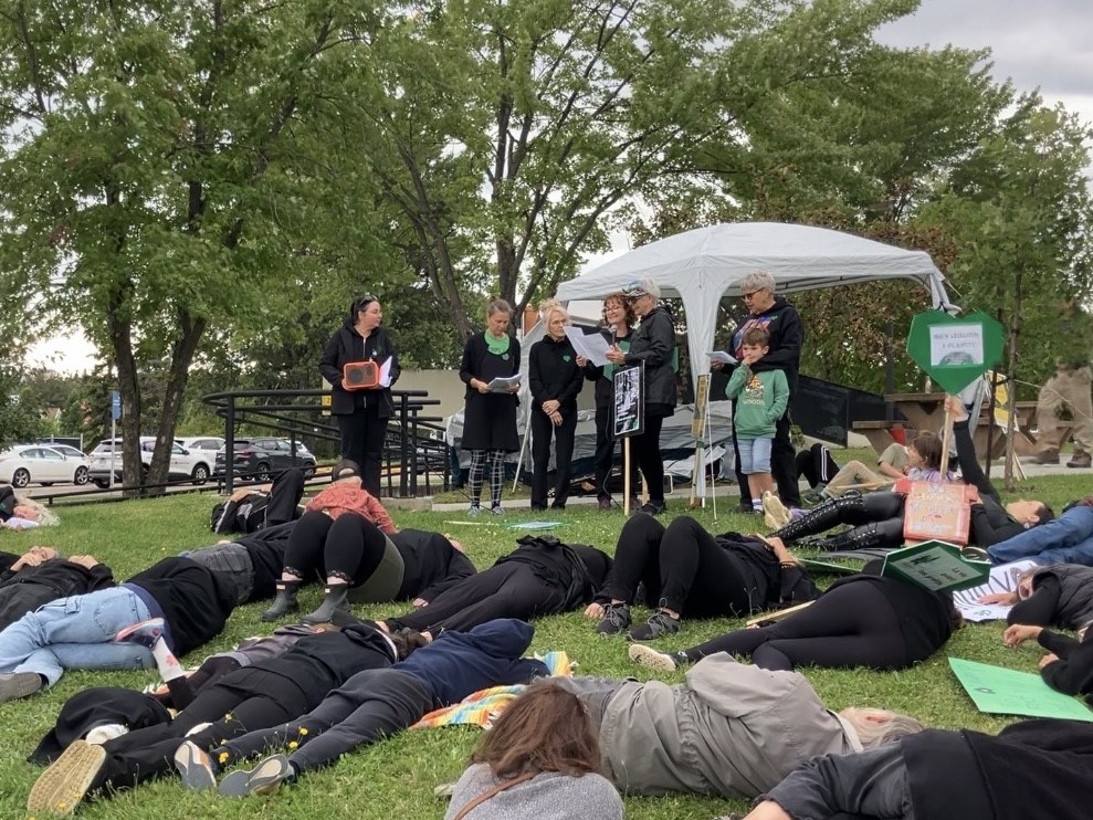 Les Mères au front du Saguenay et leurs alliés ont vécu ce qu’on appelle un « die-in ». Tout en scandant à répétition le slogan « Sans nature, pas de futur », elles sont « mortes » symboliquement pour rappeler au gouvernement provincial le droit de tous les Québécois à un environnement sain et à un air pur. L’organisme rappelle que les arbres jouent un rôle crucial pour purifier l’air que nous respirons et que le projet de loi 97, visant à moderniser le régime forestier québécois, constitue une attaque frontale contre l’avenir de nos forêts publiques. Les Mères au front du Saguenay ajoutent que la santé de la nature et la nôtre sont directement reliées.