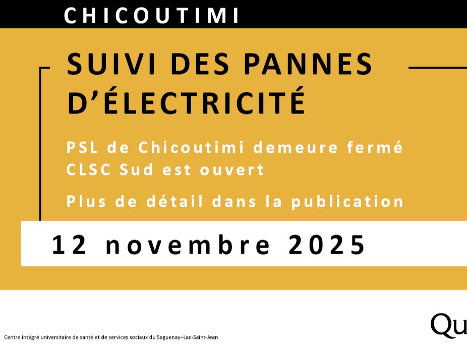 Le Point de services local (PSL) de Chicoutimi, situé au 930, rue Jacques-Cartier Est, sera fermé toute la journée du 12 novembre en raison d’une panne de courant prolongée.