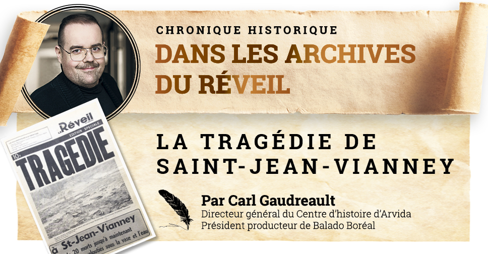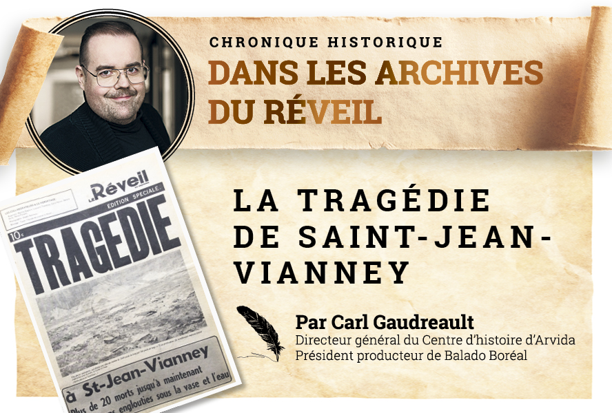 Pour cette chronique, nous retournons 51 ans en arrière. L’événement dont je vais vous parler s’est produit dans la nuit du 4 mai au 5 mai 1971. Dans une édition spéciale du Réveil, on pouvait lire en énorme titre : « TRAGÉDIE à Saint-Jean-Vianney ». Le journal le Réveil avait réussi en l’espace de quelques heures de sortir une édition qui couvrait la catastrophe du glissement de terrain de Saint-Jean-Vianney.