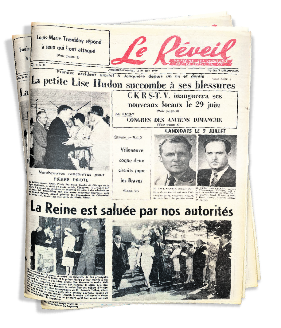 Mais pourquoi parler du jubilé de la reine Élizabeth II dans une chronique historique d’un hebdo régional? Dans l’édition du Réveil du 24 juin 1959, on peut lire en gros titre sur la première page : « La Reine est saluée par nos autorités ». Oui, nous avons eu droit à la visite de Son Altesse Royale sur le territoire Saguenéen le lundi 22 juin 1959.