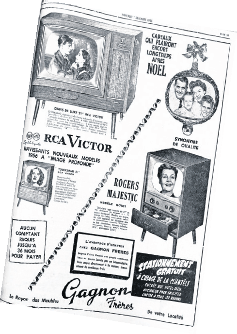 Les émissions produites localement sont arrivées au cours de l’année 1956, car il fallait trouver les commanditaires, mais aussi former les vedettes locales. Les magasins de meubles du Saguenay en profitaient pour acheter de pleines pages de publicité pour vendre des appareils de télévision.