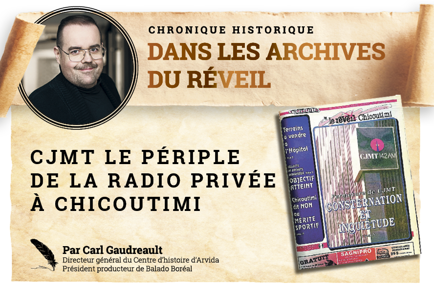Je vous propose dans cette chronique un grand voyage dans l’histoire de la radio privée de Chicoutimi. Débutons avec CJMT. Et pour ce faire nous devons nous reporter dans les années 50. Chicoutimi était en pleine explosion démographique et économique. Sa rivale, Jonquière, possédait une station privée depuis 1947, Chicoutimi se devait d’avoir une antenne de radio privée locale! Une équipe d’homme d’affaires qui était composée du Dr Georges-William Tremblay, M. J-O Masse, Paul Rény, Gaston Vaillancourt et Jacques Bordeleau, s’est lancée dans l’aventure de la radio privée.
