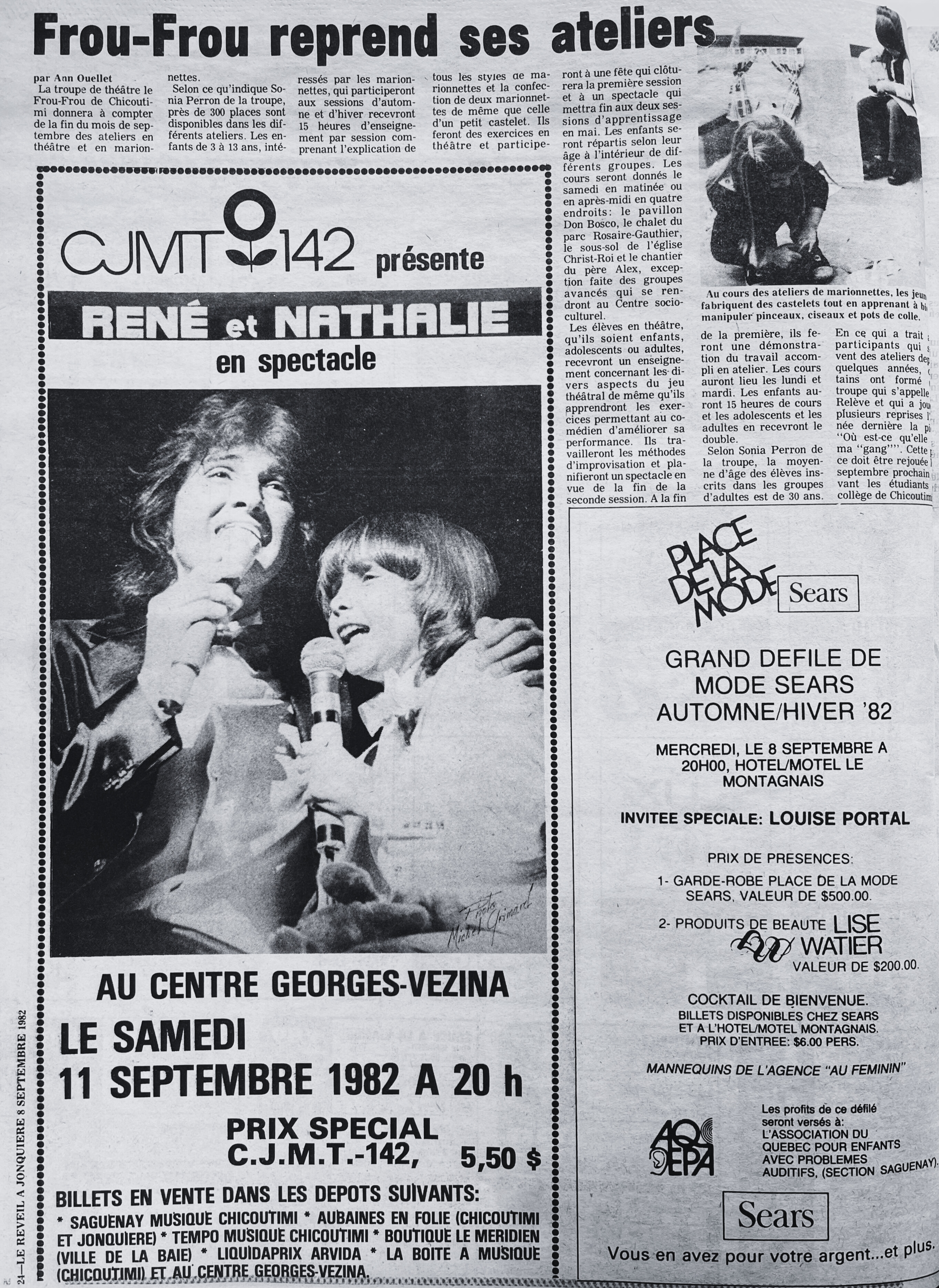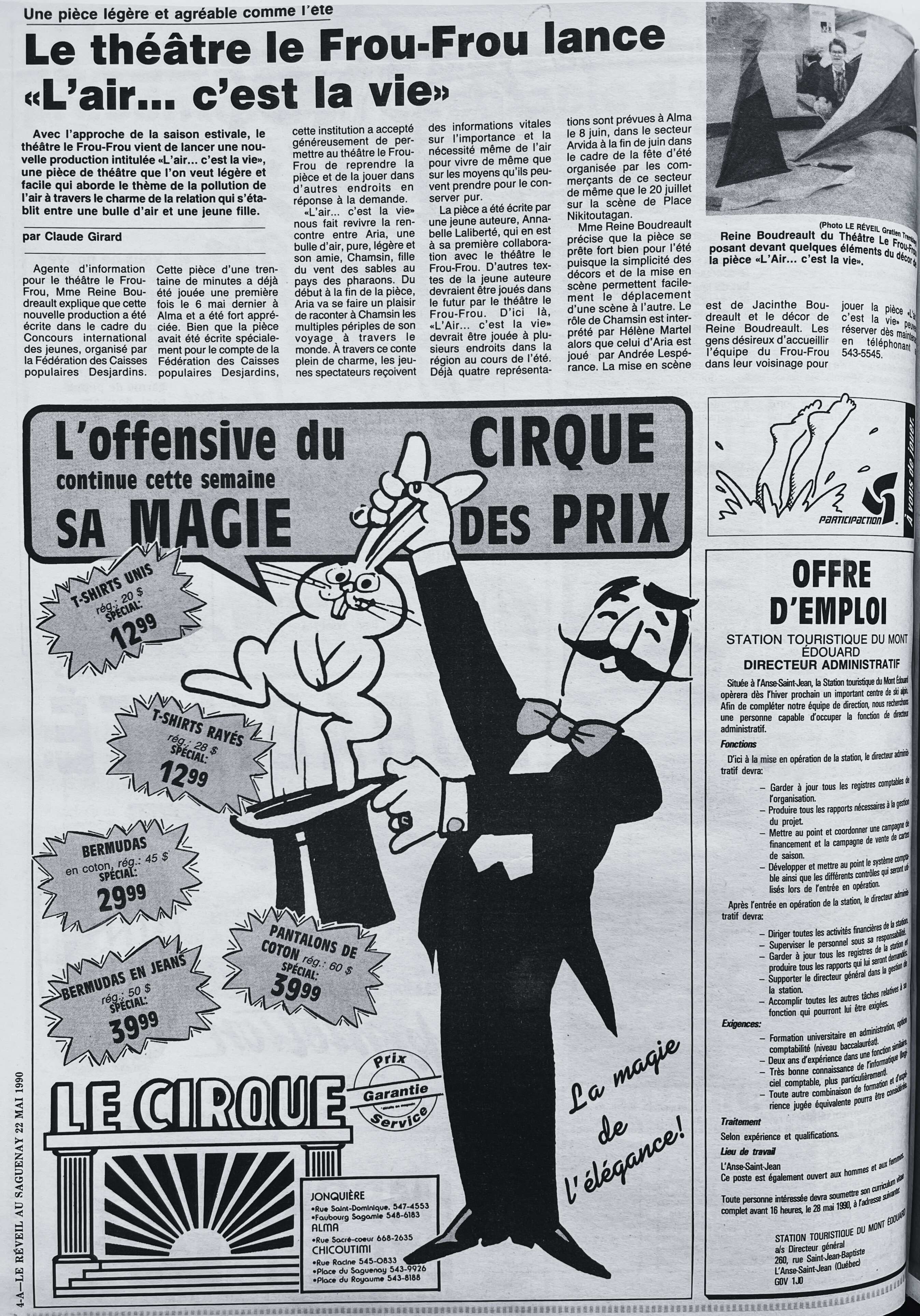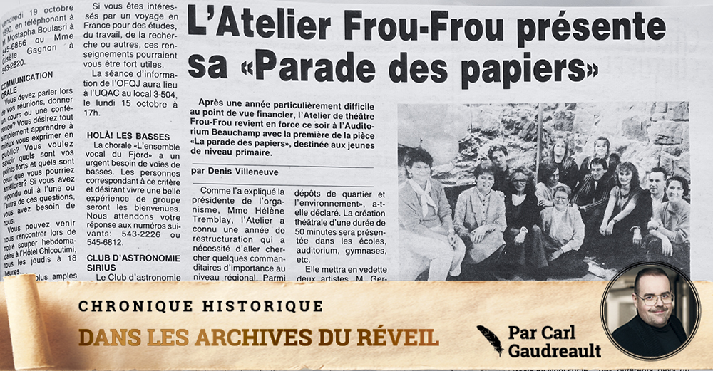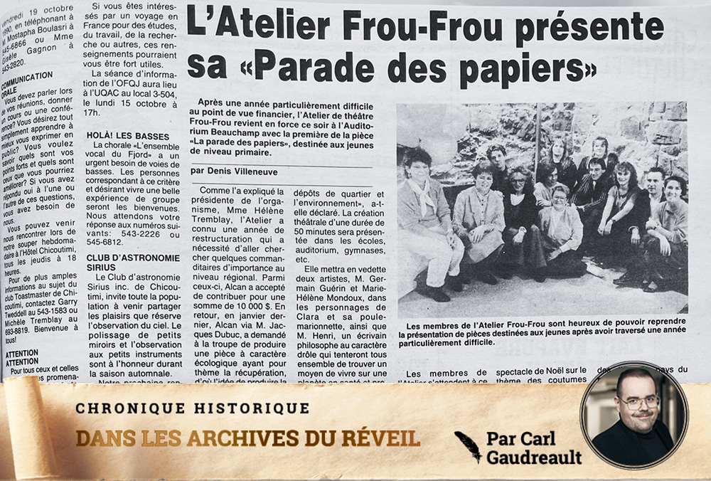 Le refrain de la chanson Frou-Frou va comme suit : « Frou-Frou par son jupon la femme, » dans le cas de ma chronique de cette semaine, on pourrait dire plutôt : « Frou-Frou par son théâtre la femme! » Et cette femme, c’est Lison Vézina, une grande créatrice et entrepreneuse culturelle qui avec sa compagnie de théâtre a réjoui les cœurs d’une génération de jeunes enfants dont je fais partie. Voici l’histoire de l’Atelier de Théâtre Le Frou-Frou.