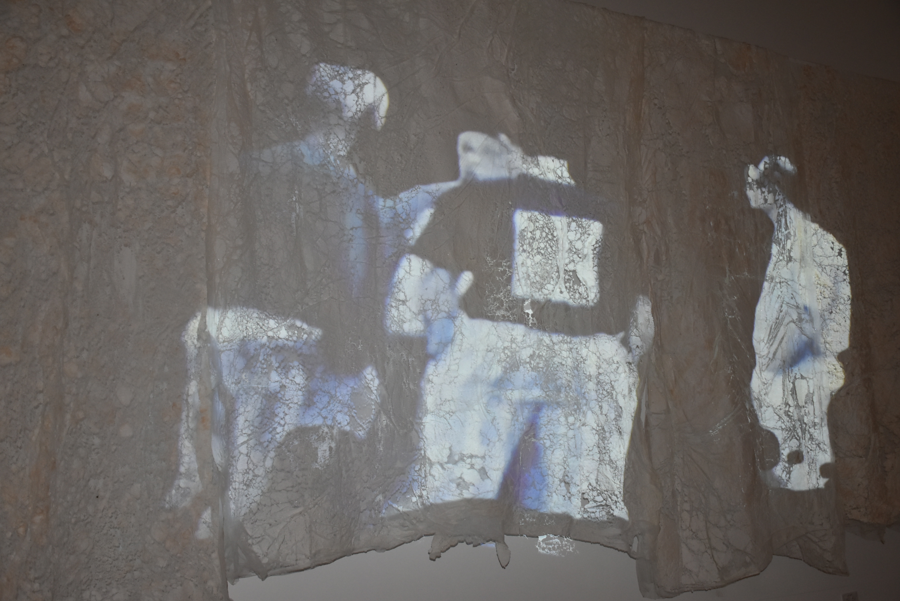 Au fond de la pièce, des personnages anonymes défilent doucement sur une dentelle murale.