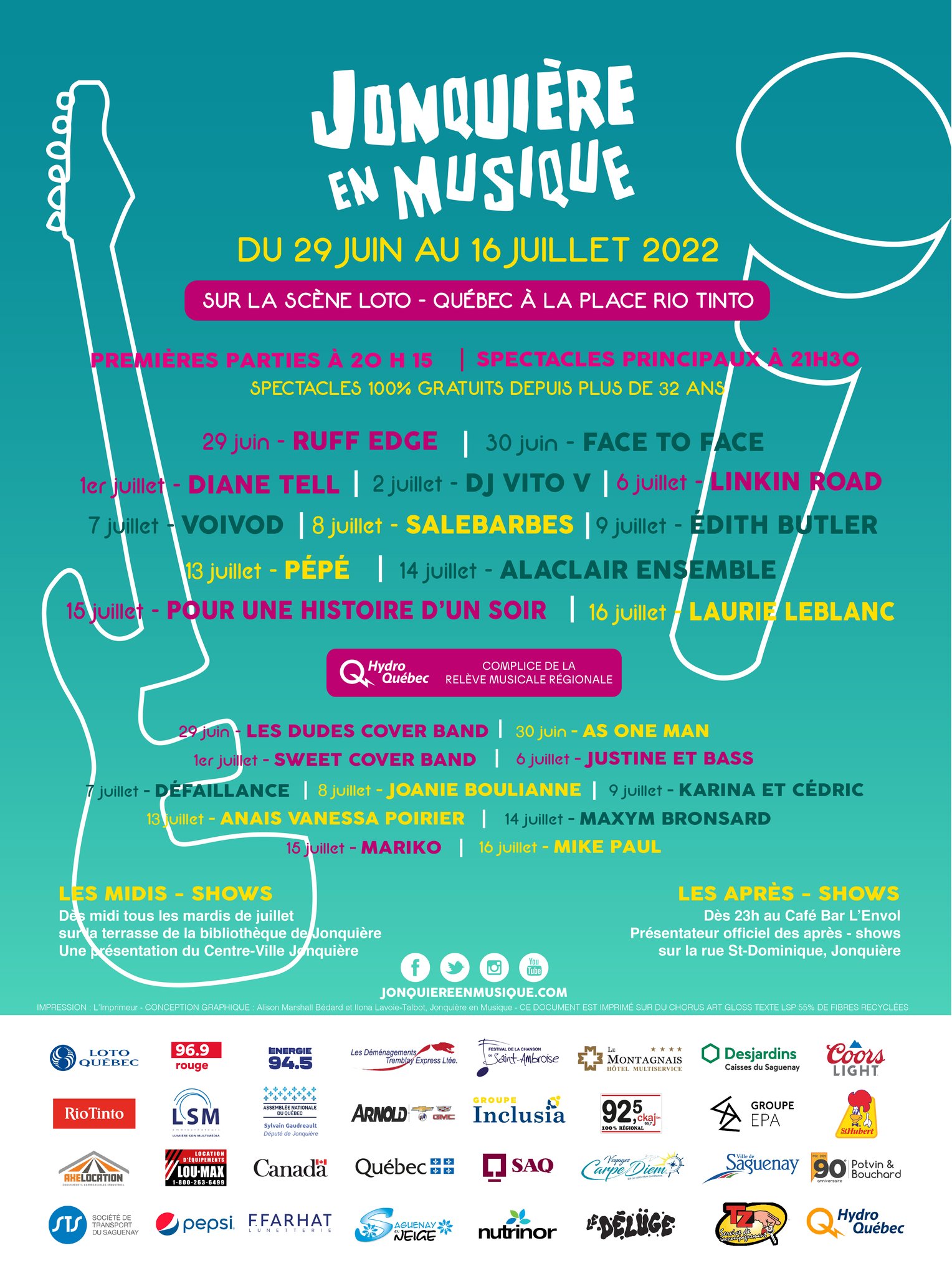 C’est à nouveau une programmation très variée qui sera présentée cet été lors de la nouvelle édition de Jonquière en musique. Du 29 juin au 16 juillet prochain, les festivaliers pourront assister gratuitement aux spectacles de Voivod, de Diane Tell, des Salebarbes ou encore d’Alaclair Ensemble.