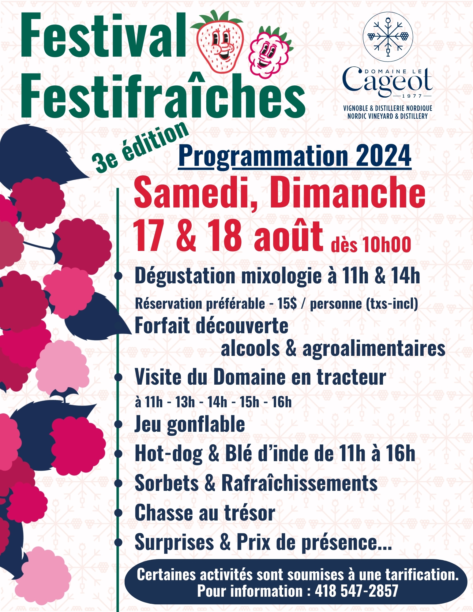 La fin de semaine sera aussi l'occasion pour les intéressés de découvrir de nouveaux alcools revisités, au couleur du Domaine Le Cageot. Les visiteurs peuvent se référer à la programmation complète sur les réseaux sociaux du Domaine Le Cageot, ou encore sur le site internet des Festifraîches.