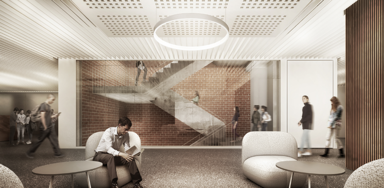 Certains murs de briques seront abattus afin de faire « respirer » l’étage. Le couloir principal offrira quant à lui un point de vue en hauteur sur l’ensemble du centre social. Des vitres remplaceront les murs de briques des cages d’escalier qui se dirigent au deuxième étage.