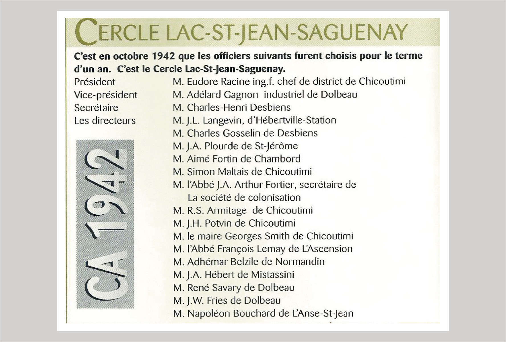 Suivant les souhaits des administrateurs de l’AFQ, nous assistons, en 1942, à la formation du Cercle régional du Lac-Saint-Jean/Saguenay ainsi qu’à celle de son mouvement jeunesse, les clubs 4-H. Le bureau central aide financièrement ses Cercles régionaux.