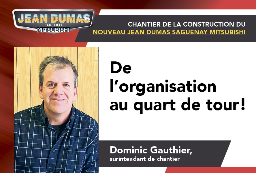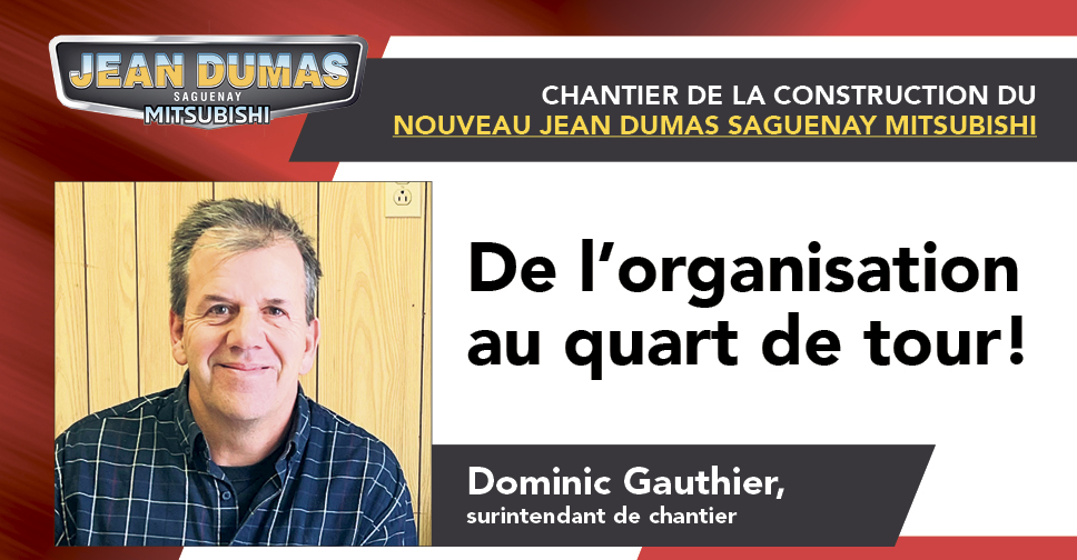 « Dans un chantier comme celui-ci et avec un échéancier aussi serré et précis, la coordination des différentes actions est tellement importante » commente le surintendant de chantier de la nouvelle construction du Jean Dumas Saguenay Mitsubishi à Saguenay, Dominic Gauthier.
