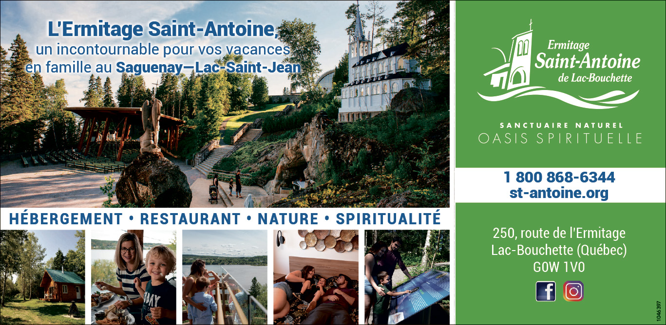 Niché en pleine nature, au bord du lac Ouiatchouan, l’Ermitage Saint-Antoine de Lac-Bouchette est un véritable havre de paix où se croisent spiritualité, détente et découvertes en famille.