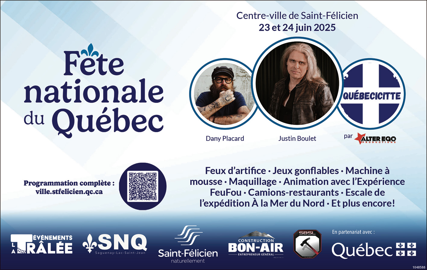 Les 23 et 24 juin 2025, le Saguenay-Lac-Saint-Jean vibrera au rythme de la Fête nationale du Québec. Au coeur de ces festivités, l’événement régional se tiendra au centre-ville de Saint-Félicien, avec une programmation festive et rassembleuse proposée par les Événements La Trâlée.