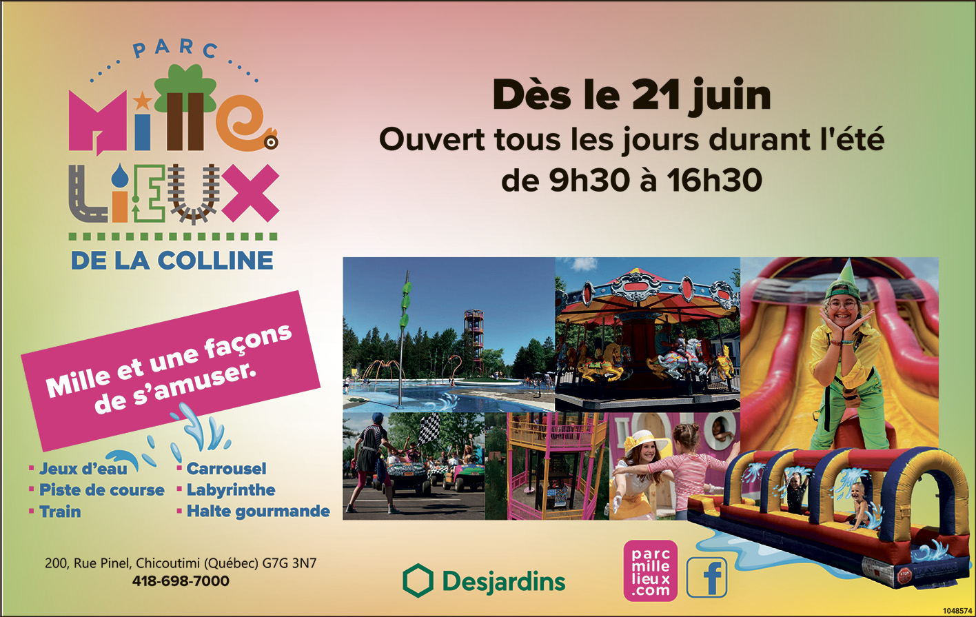 Cet été, le Parc Mille Lieux de la Colline sera encore la destination préférée des enfants au Saguenay! Profitez-en dès le 21 juin. Le Parc sera ouvert tous les jours de l’été de 9 h 30 à 16 h 30.