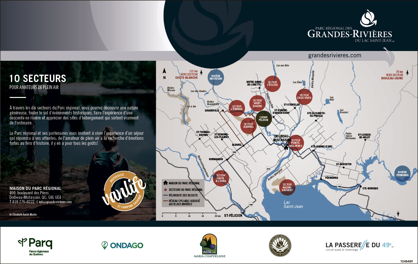 Go-Van, le plus grand réseau de vanlifeurs au Québec, est le partenaire officiel du Parc régional. Réservez en ligne et profitez des sentiers pédestres, toilettes sèches et sites de feu disponibles aux secteurs L’Écluse, Albanel et L’Énergie. Pour le camping sauvage, des sites paisibles aux bords des rivières sont gages de moments de qualité en pleine nature.