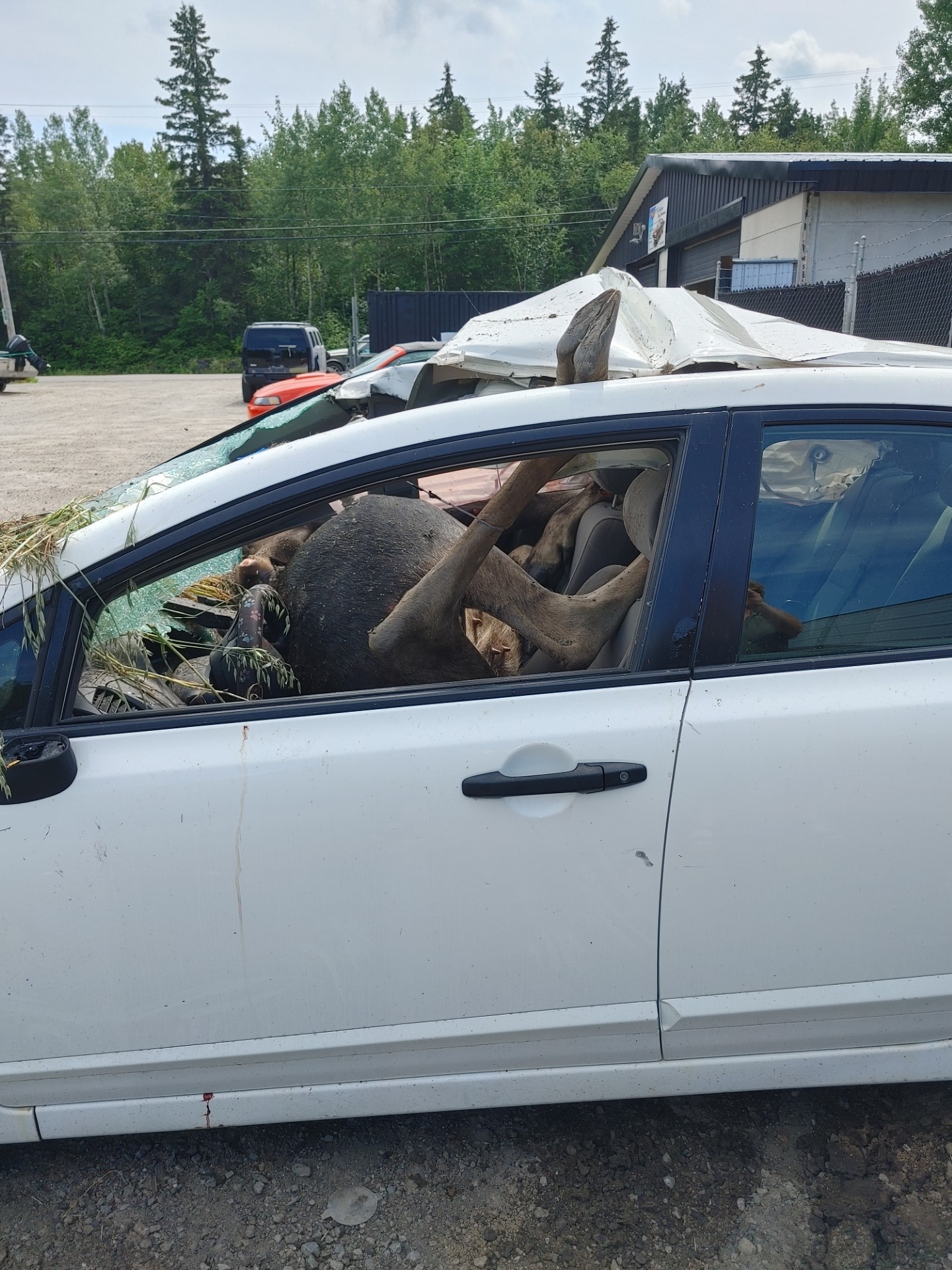 En effet, telle a été une autre surprise de constater que sur le coup de l’impact, la bête, qui était alors en plein milieu de la route Mathias à Shipshaw, avait fracassée le pare-brise de l’automobile de tout son poids pour finir recroqueviller sur le siège passager, directement aux côtés de la jeune femme. Le choc, l’incertitude et les questionnements se sont ensuite vite fait sentir lorsqu’elle a découvert que la carcasse de l’animal se trouvait encore à l’intérieur de son véhicule, considéré maintenant comme une perte totale.