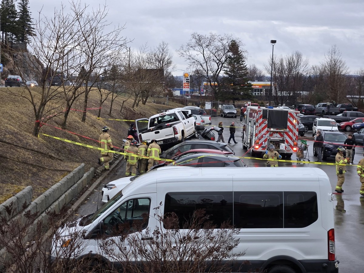 Un accident spectaculaire s’est produit cet après-midi à la hauteur du IGA de Chicoutimi-Nord. Une camionnette a fait une sortie de route, finissant son parcours sur le toit de véhicules stationnés.